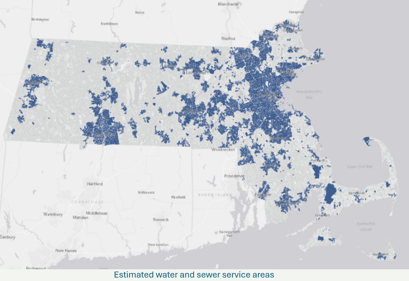 The adjacent map highlights locations that are estimated to have both water and sewer infrastructure. These services are available across a substantial part of eastern Massachusetts and parts of the Pioneer Valley with smaller pockets scattered across other parts of the state. While a more granular analysis might differentiate between places that have just one of the two services (water or sewer but not both), our approach only considers places with both services to be connected to water/sewer infrastructure.