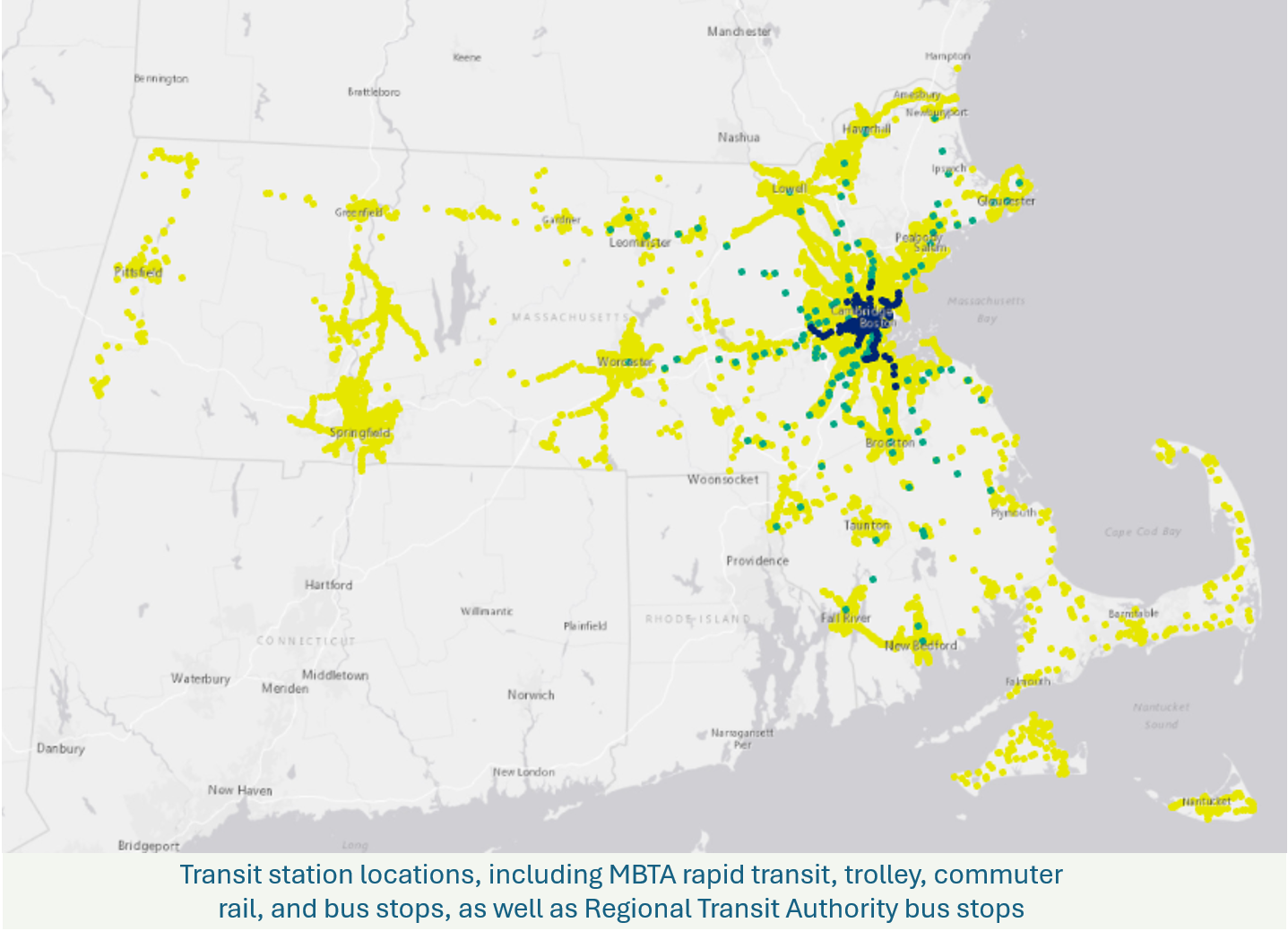 Proximity to public transit service – For this analysis, we include all MBTA train and trolley stops (including both commuter rail and subway service) as well as bus stops that are part of one of the 15 Regional Transit Authority (RTA) systems, including the MBTA. Ferry service and private, corporate, and institutional transportation services are not included. The adjacent map shows the location of rapid transit, commuter rail, and bus stops across the state. Properties that fall within a half mile of a transit stop are considered to have transit access.