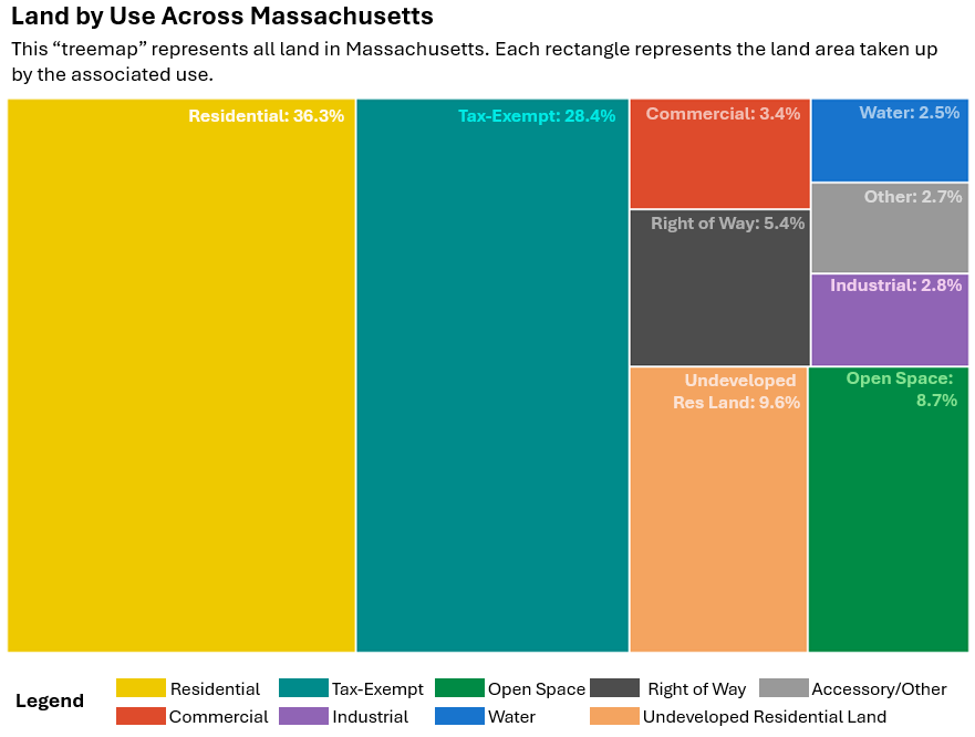 Since this land use category includes a diverse range of property and ownership types, there can be a lot of variation in the data across communities. While the data makes it possible to distinguish undeveloped tax-exempt parcels from those that are developed, this preliminary analysis did not take that step. Readers should understand there is likely ambiguity and overlap between this land use category and the open space category (visualized in green in the treemap).