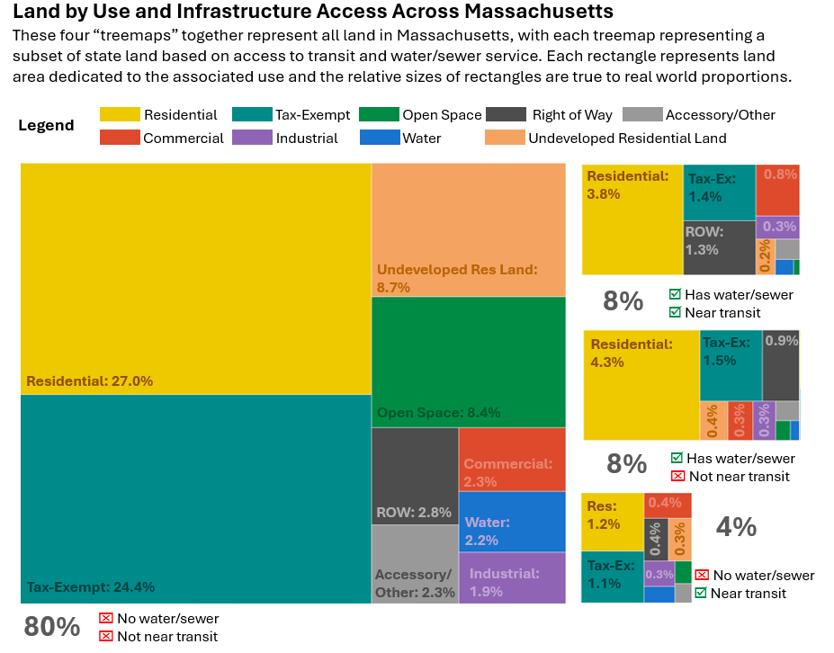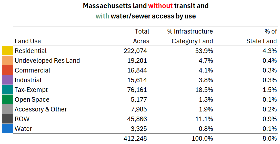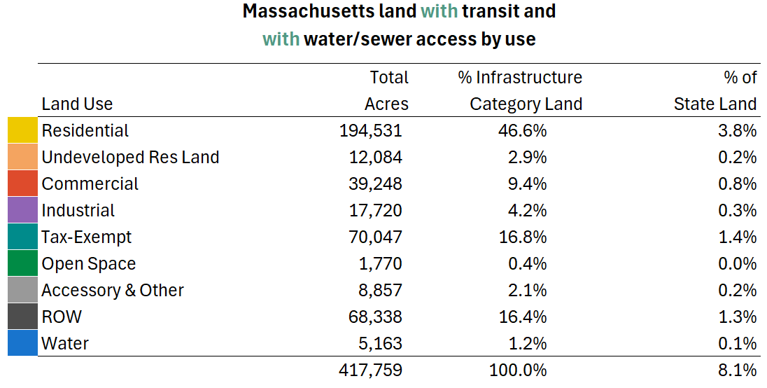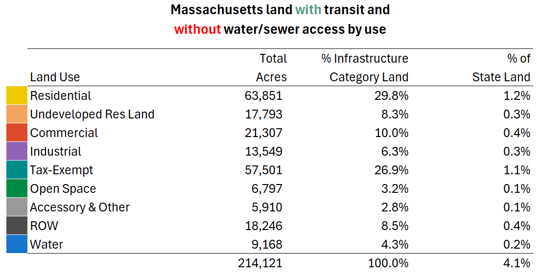 With every parcel in Massachusetts coded by both transit and water/sewer availability, we can now summarize land across the Commonwealth by current use and dig into the type and density of housing in areas with differing infrastructure.