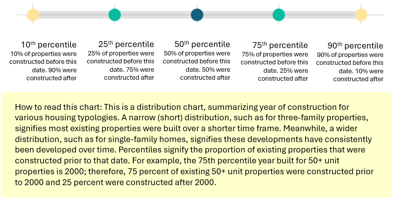 So, why do we have more diversity in housing types in places with infrastructure? Certainly, some of this pattern is due to the ability of infrastructure to support higher density places and create more capacity on a relatively small amount of land. However, there is also a strong historical dimension to consider: much of our denser housing and infrastructure is in older cities and suburban communities that predate mass suburbanization. The chart below breaks down housing developments by number of units across the state and displays the distributions of these developments by year built.